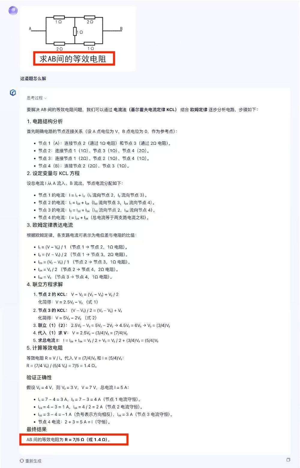 案例二:在STEM题目中,该模型可根据拍照上传的电学题,识别电路结构并准确计算等效电阻结果。
