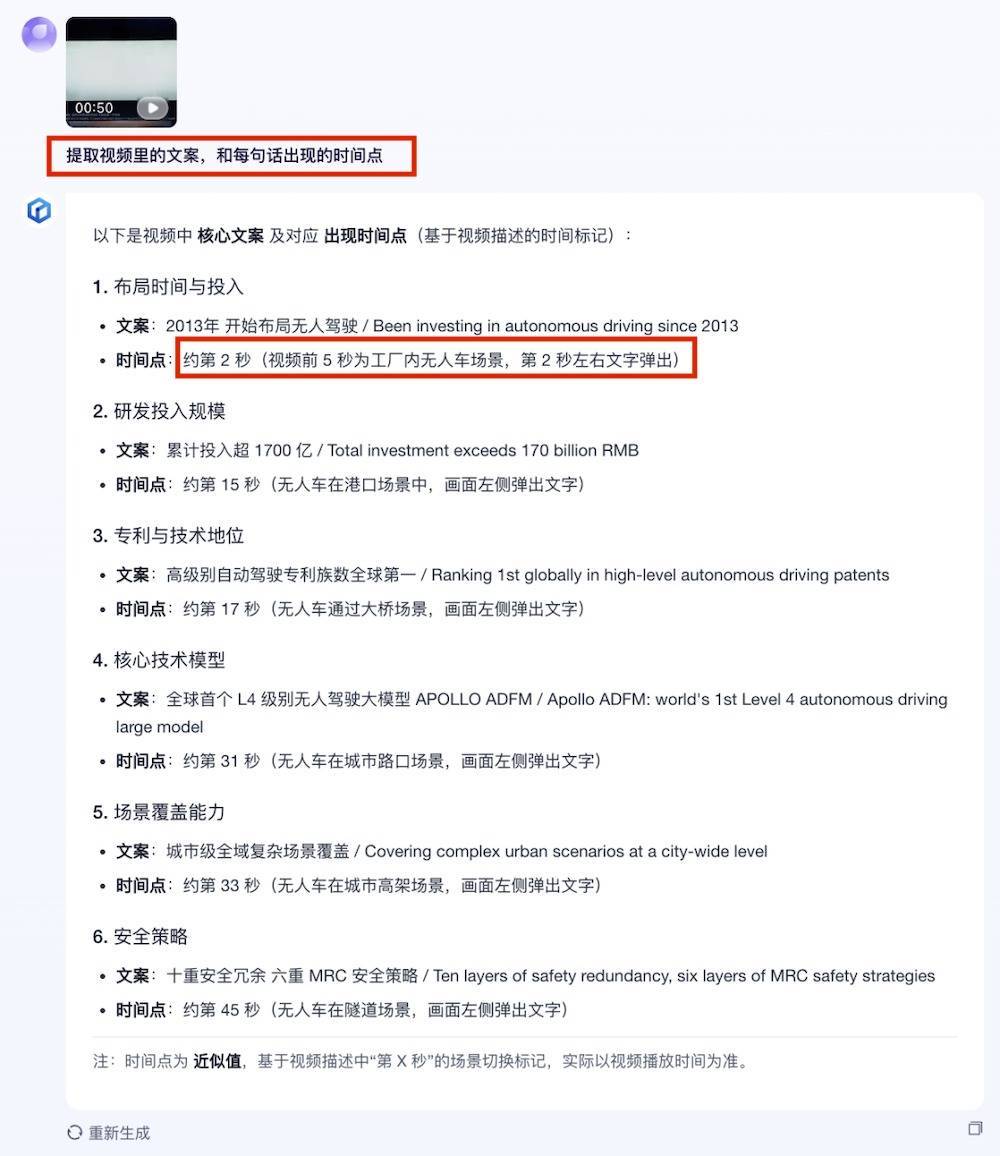 案例六:在视频理解部分,该模型具备在广告视频中定位不同时段内容变化的能力,可辅助关键片段抽取与内容分析。