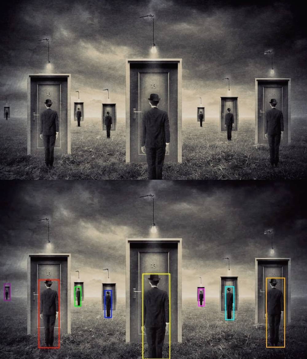 ▲测试图(上)和该模型执行视觉定位任务后输出的可视化展示图(下)。